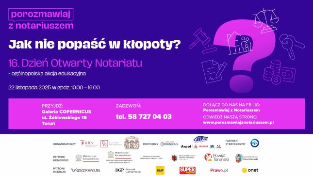 Już w sobotę, 22 listopada 2025 roku, notariusze w Toruniu będą bezpłatnie udzielać informacji prawnych podczas 16. edycji ogólnopolskiej akcji – Dnia Otwartego Notariatu.