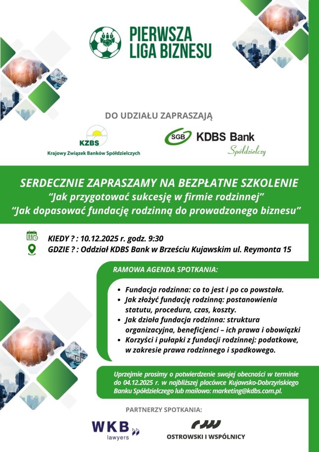 Bezpłatne szkolenie „Pierwsza Liga Biznesu” – Jak przygotować sukcesję w firmie rodzinnej oraz jak dopasować fundację rodzinną do prowadzonego biznesu.