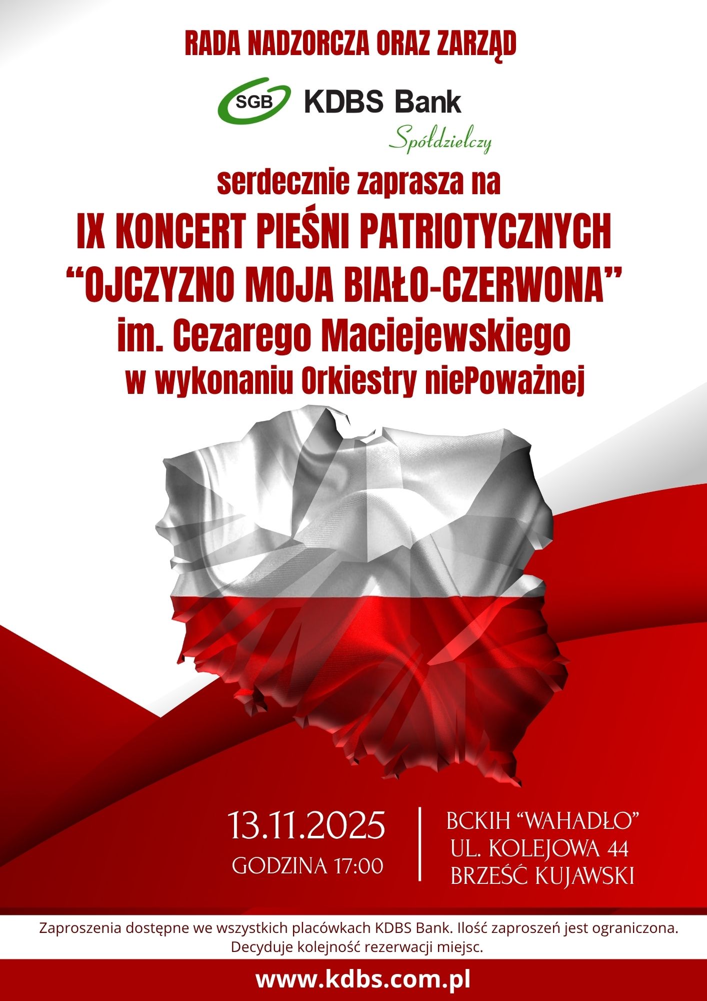 W imieniu Rady Nadzorczej oraz Zarządu Kujawsko-Dobrzyńskiego Banku Spółdzielczego serdecznie zapraszamy Państwa na IX Koncert Pieśni Patriotycznych im. Cezarego Maciejewskiego „Ojczyzno moja biało-czerwona”, który odbędzie się 13 listopada 2025 r. o godzinie 17:00 w Brzeskim Centrum Kultury i Historii „Wahadło”.